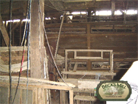 The Old Mill sat idle and was a sad reminder to the lifestyle of our pioneering ancestors. The mill's mechanical and structural elements were deteriorating. Rodents chewed away at the huge timbers of the main frame structure while floor boards rotted away from moisture damage. The mill structure was unsafe to enter and unfortunately with such a unique historic structure sitting empty vandals pilfered some interior furnishings and equipment.